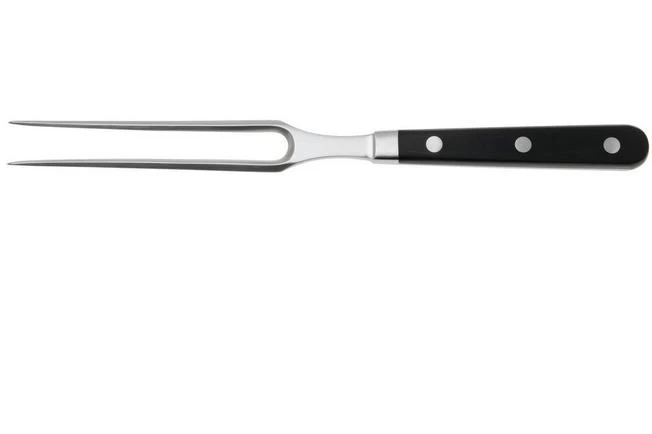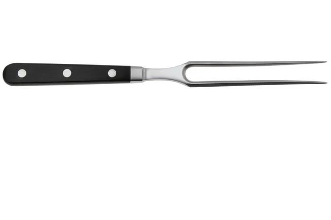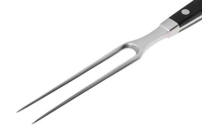 This meat fork from Victorinox Grand Maître has a robust design and feels great in hand. Just like the world-famous Victorinox pocket knives, Victorinox kitchen knives are made with great attention to detail. The POM handle is seamlessly attached to the forged bolster. The rivets give this meat fork a classic look. The handles of the meat fork is relatively large, ensuring it’s also suitable for people with large hands.
