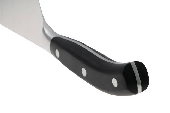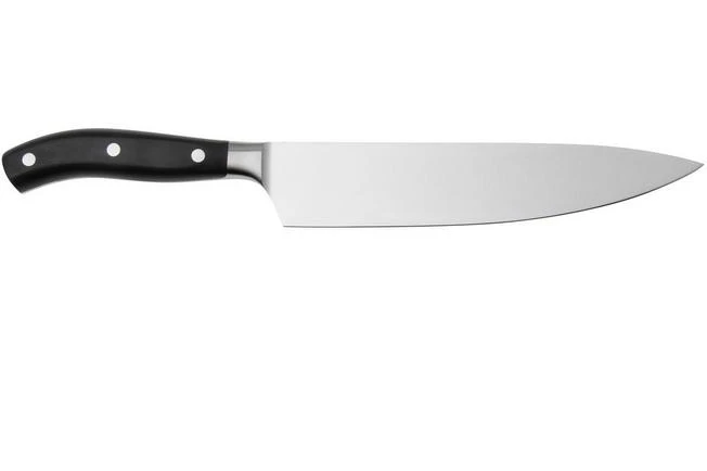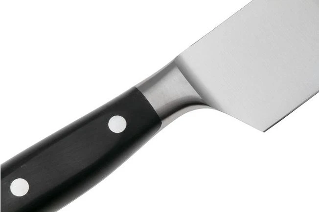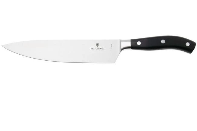 The Victorinox Grand Maître Chef’s Knife 7.7403.22G, POM, 22 cm is a large and practical kitchen knife. With a blade length of 22 cm, this knife is slightly larger than a standard chef’s knife. This larger blade offers more cutting surface, ideal for processing larger ingredients such as cabbage, squash, large pieces of meat or a whole fish.