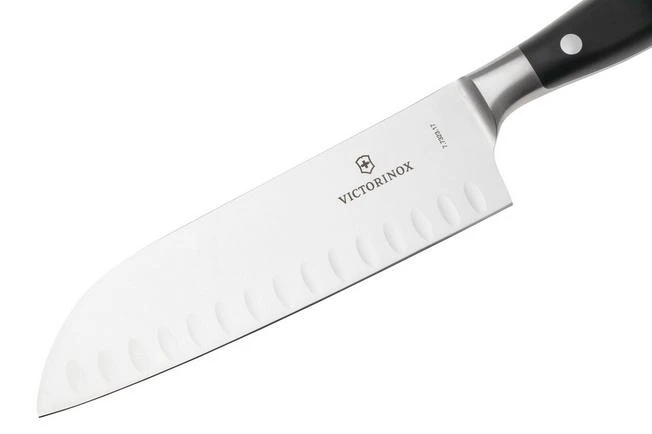 The Victorinox Grand Maître Santoku Knife 7.7323.17G, POM, dimpled santoku, 17 cm is a versatile kitchen knife. A santoku is the Japanese version of the European chef’s knife. The blade is perfect when finely cutting vegetables, meat, fish, onion, garlic and, of course, different types of herbs. The dimples in the blade ensure that ingredients don’t stick to the blade.