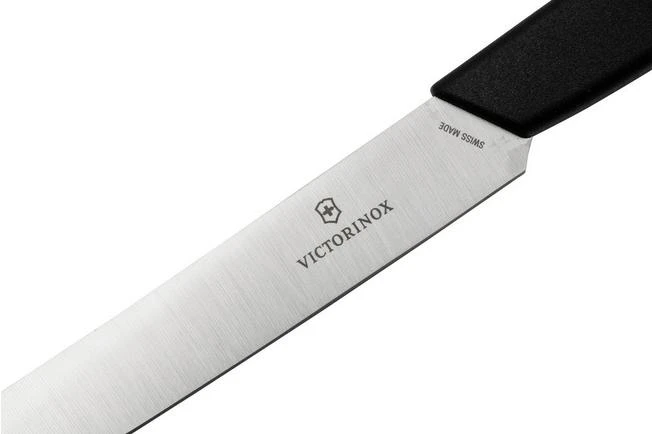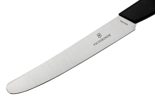 The Victorinox Swiss Modern table knife black is perfect for spreading butter, jam and other spreadable goods. The rounded tip of the blade makes smooth and even spreading of sandwich spreads very easy. With a blade length of 11 cm, this knife is also perfect for scraping out empty jars. The knife is razor-sharp and therefore also suitable for cutting sausages, cheese and soft bread.