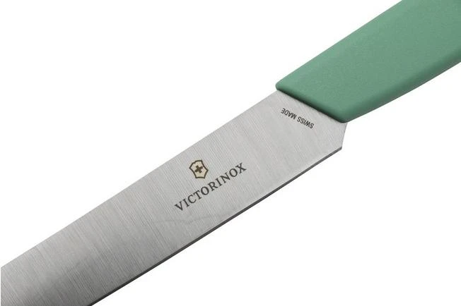 The Victorinox Swiss Modern table knife mint green is perfect for spreading butter, jam and other spreadable goods. The rounded tip of the blade makes smooth and even spreading of sandwich spreads very easy. With a blade length of 11 cm, this knife is also perfect for scraping out empty jars. The knife is razor-sharp and therefore also suitable for cutting sausages, cheese and soft bread.